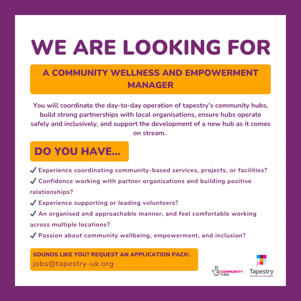 You will coordinate the day-to-day operation of tapestry’s community hubs, build strong partnerships with local organisations, ensure hubs operate safely and inclusively, and support the development of a new HuB as it comes on stream.