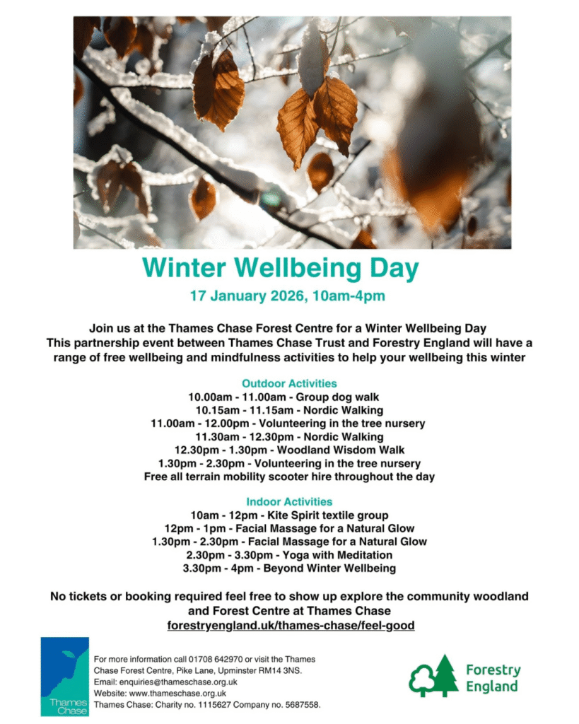Join Thames Chase Forest Centre this winter for a Winter Wellbeing Day at Thames Chase Forest Centre, delivered in partnership with Forestry England – Thames Chase and the Thames Chase Trust.